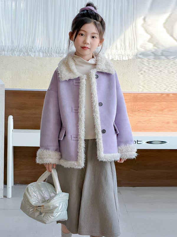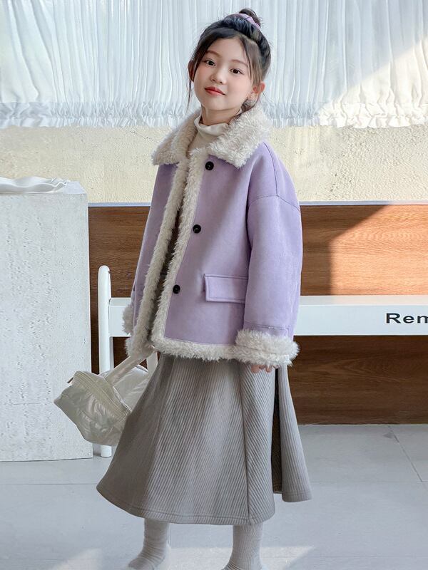 ふわふわのボアがたっぷりあしらわれたフェイクムートンジャケット。見た目以上に軽く、暖かさが続く秋冬の定番アウターです。柔らかいラベンダーカラーが上品で可愛く、韓国子供服らしいガーリーな雰囲気に仕上がります。