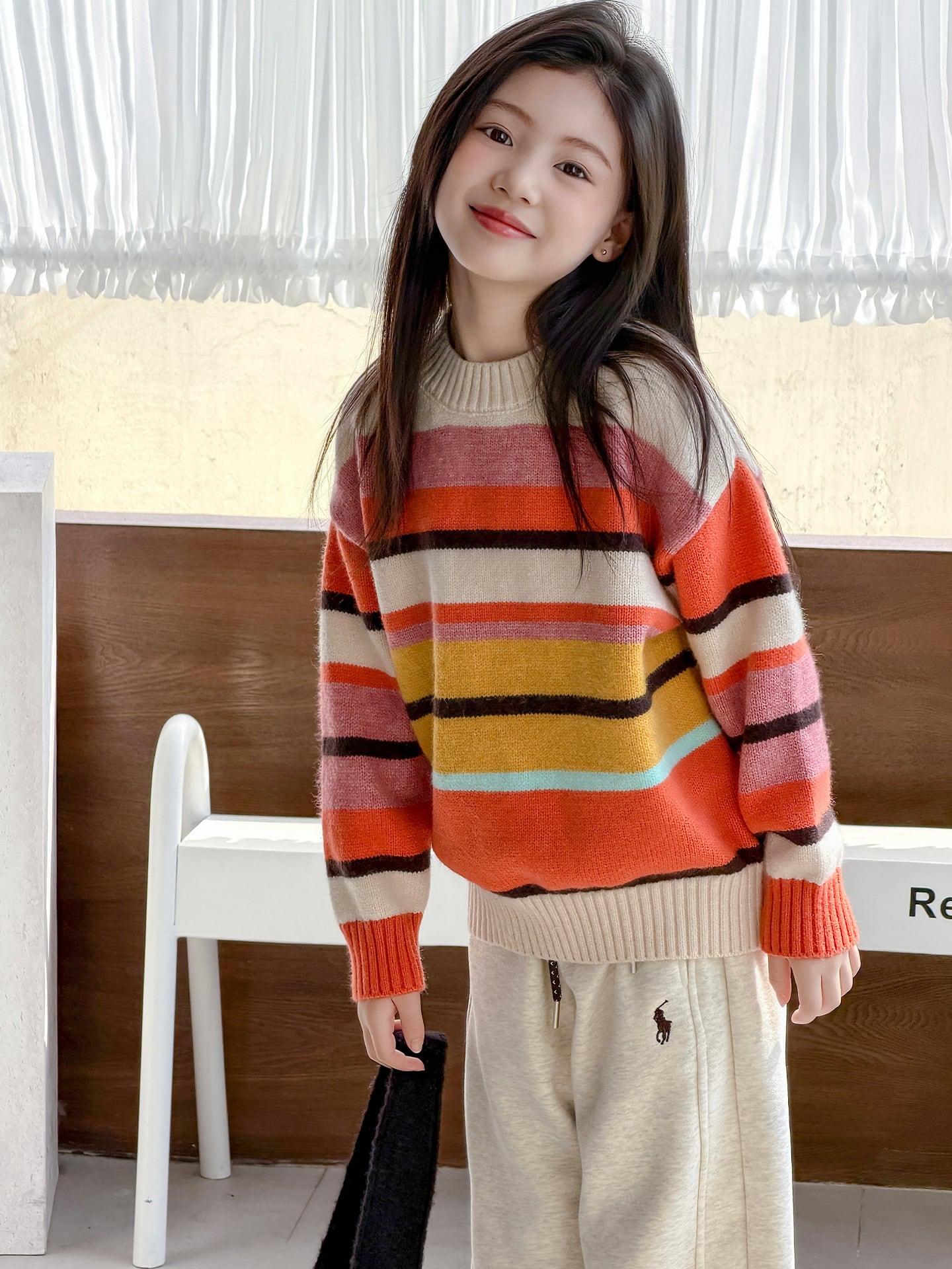 韓国子供服 ガールズファッション 女の子 ボーダーニットトップス 単品 2025・2026AW 新作 秋冬 キッズ ジュニア 柔らかカラーニット セーター 120〜170cm